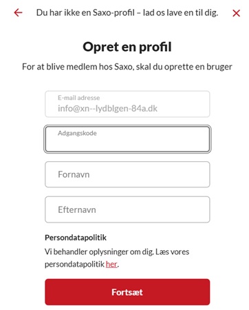 Allerførst skal du angiv den e-mail-adresse, du ønsker at koble din konto op på. Derudover skal du angive dit ønskede kodeord samt dit for- og efternavn.