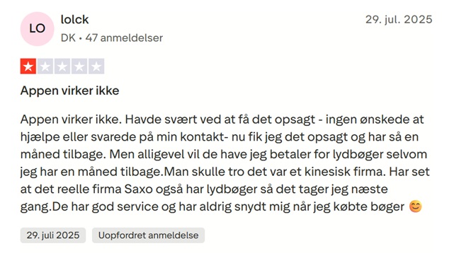I skrivende stund (august 2025) har lydbogsservicen nemlig blot opnået en samlet karakter på 2,3 ud 5 stjerner på anmeldelsesplatformen. En karakter, der baserer på mere end 2.140 anmeldelser.