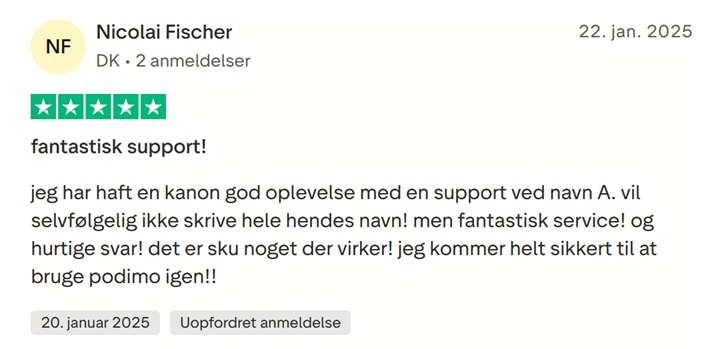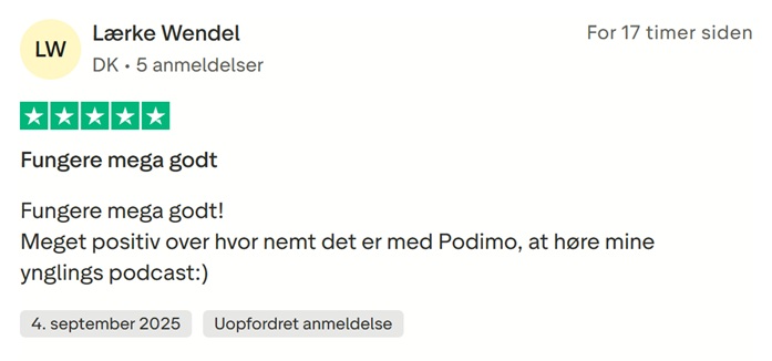 I det kommende dykker vi ned i, hvad Podimo roses for af de positive Trustpilot-anmeldere, hvorefter vi zoomer ind på, hvad Podimo kritiseres for af de negativt stemte af slagsen.