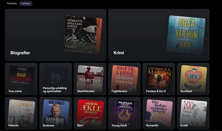 Som sagt er det yderst let at navigere rundt i Podimos app. Søgefunktionen fungerer upåklageligt, og i lydbogssektionen finder man en række relevante kategorier, der gør, at man let kan få præsenteret et interesseret udvalg inden for ens yndlingsgenre.