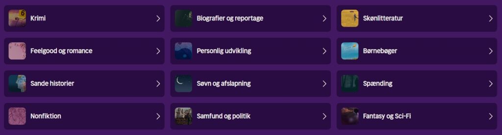 Herunder ser du et lille udsnit af de kategorier, som Nextory udbyder en hulens masse spændende lydbøger indenfor. Forhåbentlig illustrerer dette lille udsnit mangfoldigheden i tjenestens store bogudvalg.
