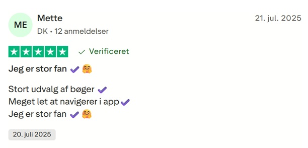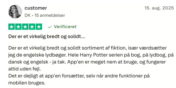 Sidst, men ikke mindst bør Nextory roses for sit gode forbrugeromdømme. På Trustpilot har lydbogsappen i skrivende stund (september 2025) opnået en samlet karakter på 4,3 ud af 5 stjerner, og i Google Play Store og App Store scorer Nextorys apps også rigtig fornemme karakterer.